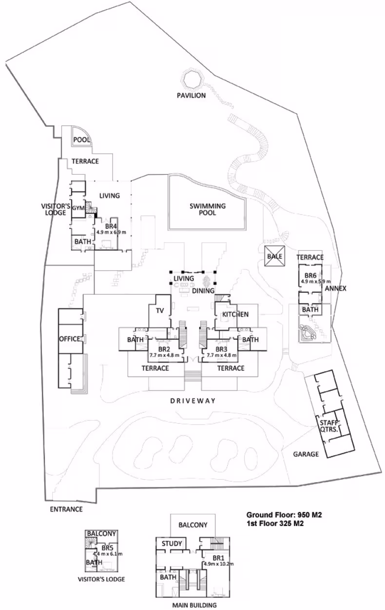 The property has 3 villas that contain a total of 7 bedrooms (6 en suite bathrooms), a 50-foot infinity pool, an infinity plunge pool, a gym, Wi-Fi, entertainment room with satellite TV and 600+ DVD’s, central air conditioning, a total of 5 buildings, 2 outdoor bales, 4 private outdoor showers, a Jacuzzi, 5 balconies, various sound systems and iPod docks, and extensive gardens.