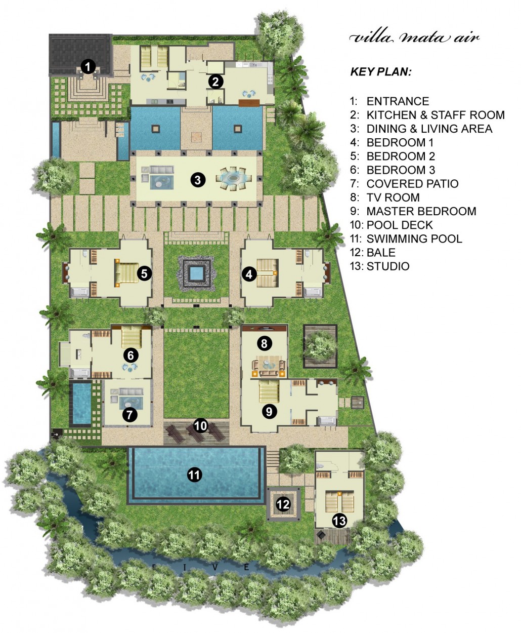 The single storey classy wood shingle-roof property expands from the narrow entrance of the Angkul-Angkul, a traditonal Balinese door to the Central Bale, the lounging and dining pavilion, complemented by a fully equipped kitchen. This steps down to a flat lawn flanked by pavilions on either side; 2 twin bed luxury suites and 2 master luxury suites. One master suite includes a fully equipped multi-media room and a secret garden set in the back for alone time… whilst the other includes a covered terrace with a massage table for a pampering time. When you rent Villa Mata Air, the loveliest surprise is a further 5th bedroom pavilion (Studio) hidden from sight along the curve of the Pangi River, comprising of a twin or double bedroom set up with ensuite bathroom, flat screen TV. This riverside bedroom can be converted into an air-conditioned living room with TV if the villa is rented as a 4 bedroom villa.