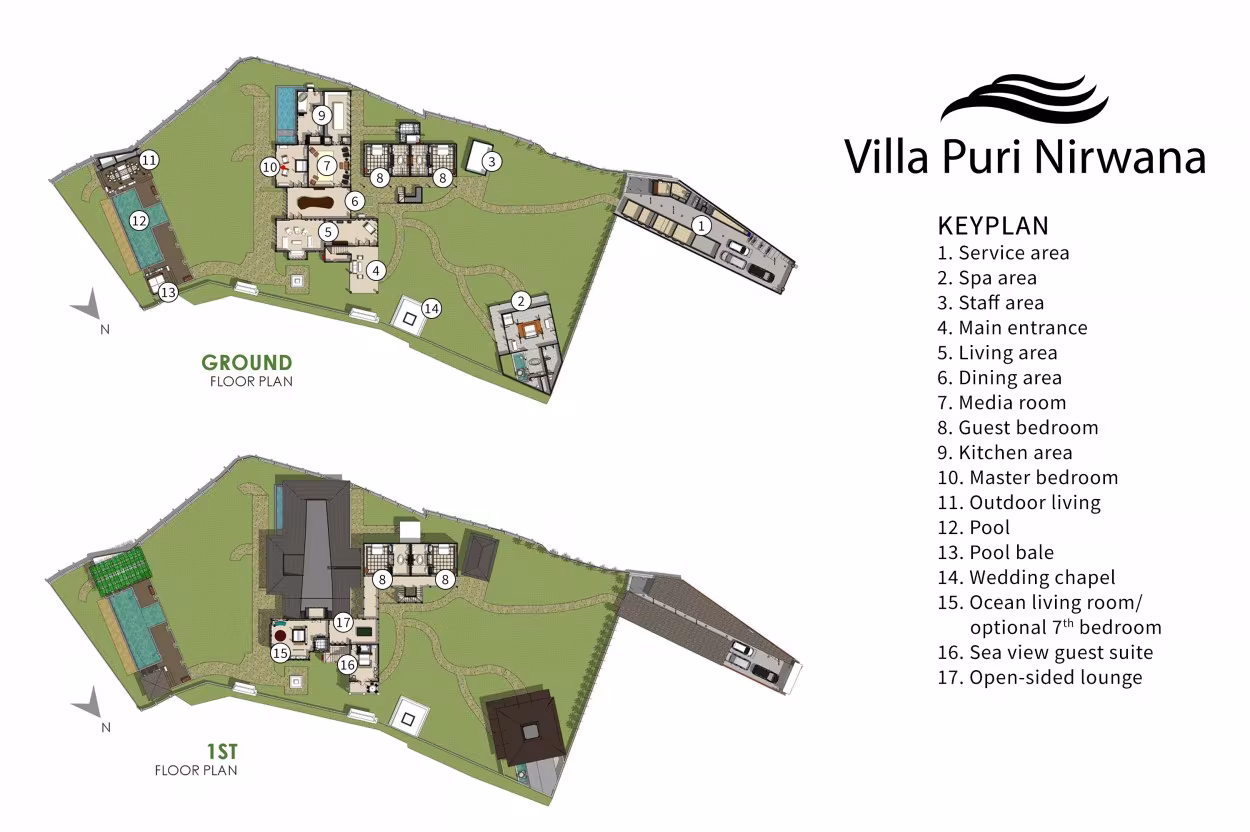 Villa Puri Nirwana’s main living areas, master suite and one guest bedroom occupy a contemporary two-storey ocean-facing building, linked to the two-storey Garden Wing sleeping pavilion behind. From the grand pivot-door entrance, an open reception area leads into the villa, where the dining room runs the full length of the ground floor, opening onto a formal living room to one side, and the Master Suite and media room (with French doors to the kitchen) on the other. From the reception area are stairs to the open-sided lounge, ocean-vista living room (which doubles as the villa’s seventh bedroom) and Sea View guest suite. Colonnaded verandas link this building on both levels to the Garden Wing where two ensuite guest bedrooms occupy each level, linked by another staircase as well as an elevator. A separate joglo within the gardens houses the villa spa, and at the beachfront is the pool, sundeck, balé and dining gazebo.