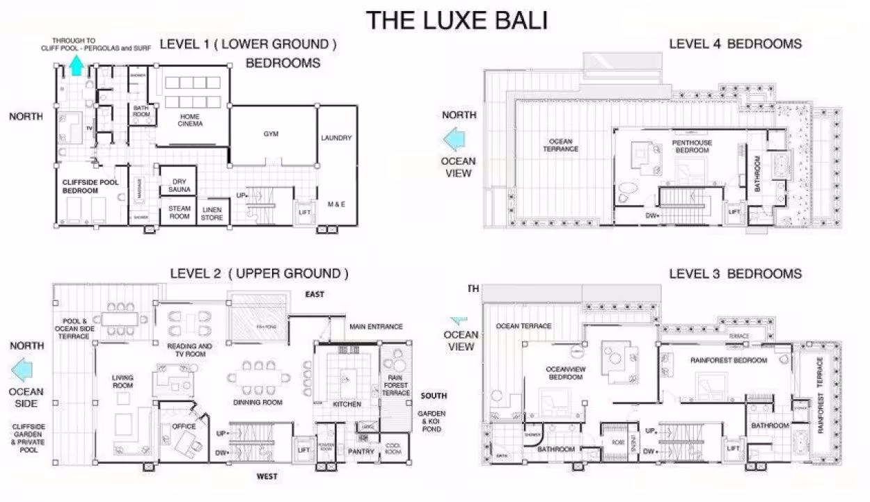 All four floors of The Luxe Bali are wheelchair accessible via the 6-person elevator. The villa also offers a Gym (which easily converts into a children’s room), Swedish Sauna, Steam Room and a Spa manned by two fully trained therapists. A climate-controlled Home Theatre features a 3 metre diagonal screen and leather reclining chairs, including a double love seat. A Smart Home System, programmed for easy, intuitive use by the Guest, controls the lighting, music, CCTV and alarm system – one can run the villa from one’s chair – or bed! Instant hot water, constant water pressure and micro-filtered, UV-treated, fully-drinkable rainwater for the showers, vanities and baths are but a few of the unique features illustrating the attention to detail which is the leitmotif of this unique property.