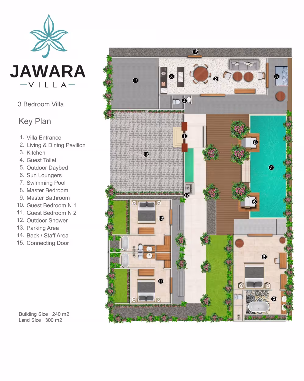 The moment you lay eyes on Villa Jawara for the first time is etched in your memory forever. Wooden doors open to unveil your exclusive oasis for the upcoming days and nights. The paradisiacal 300 square-meter property is landscaped with various palms, Frangipani trees, tall grasses, tricolor Croton and Gardenia bushes, accented by floral stone wall reliefs, enormous ornamental vases and garden lights.